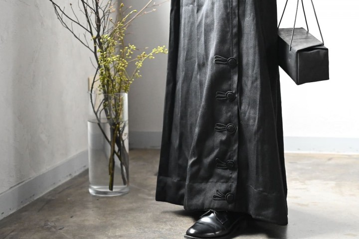 両サイドのポケットから裾にかけて伸びる生地の重なりは、ラップタイプのようにも見え