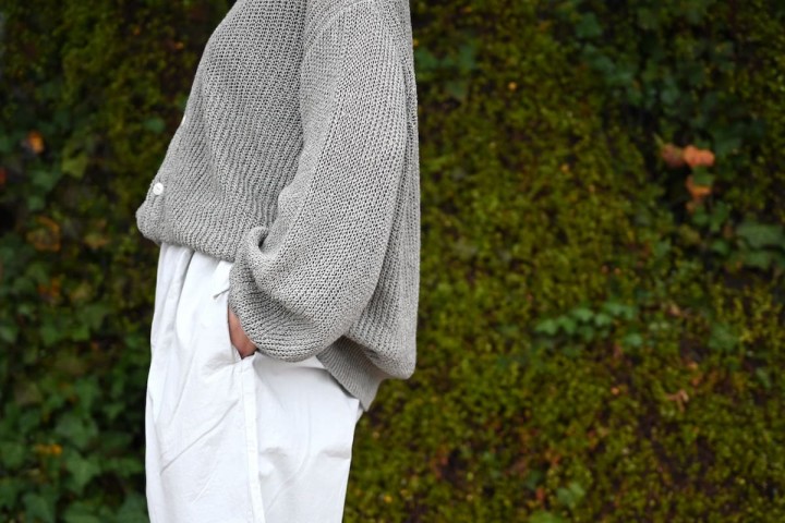 ゆったりとしたドロップショルダーと幅広の袖口。