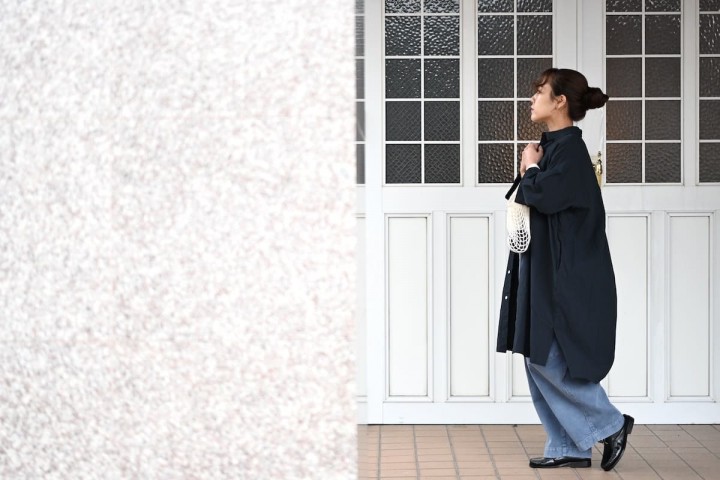 Tシャツにワイドな刺子パンツ、メンズライクなスタイルに羽織って。