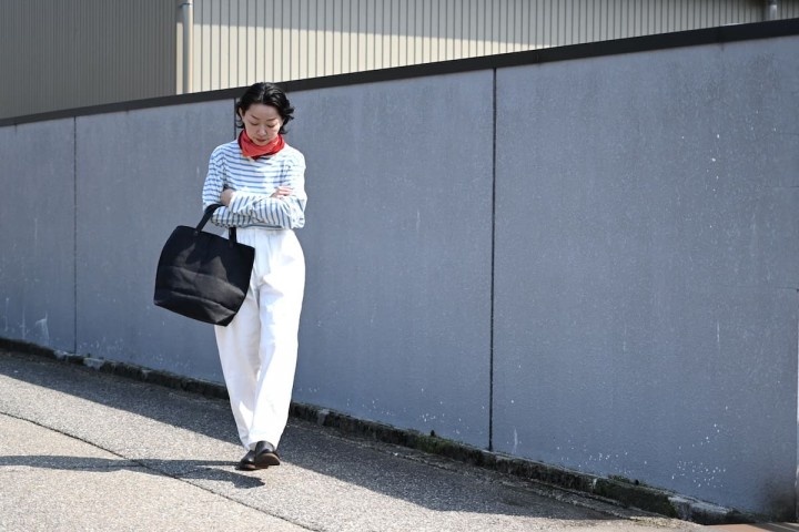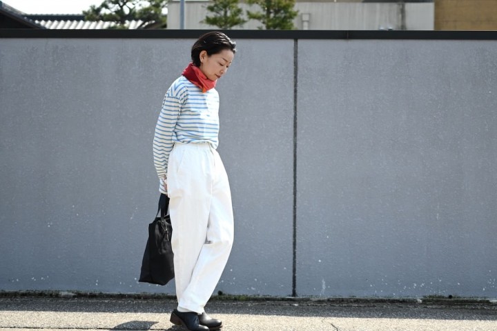爽やかな水色のボーダーに、テーパードのスッキリホワイトパンツ、バッグとシューズはブラックで引き締めた装いに、そっと赤を足す。