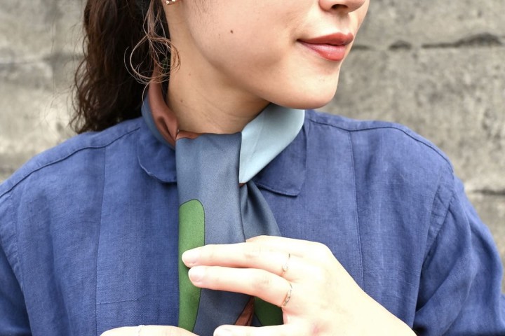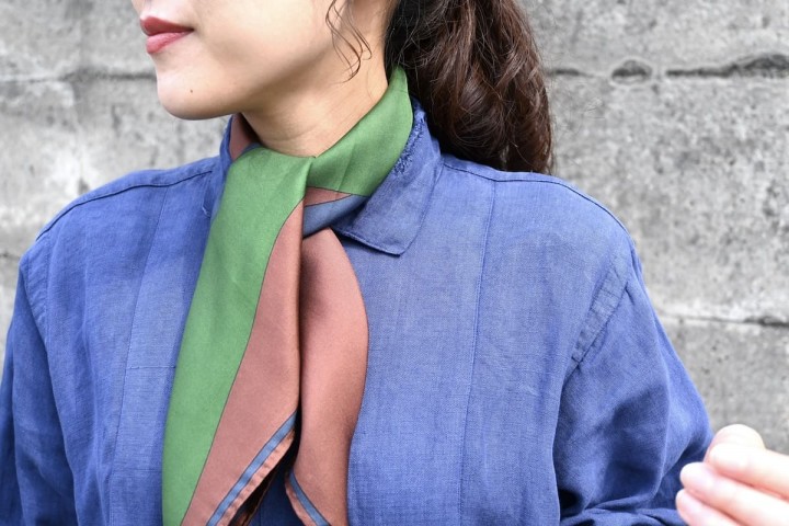 4色入ったスカーフなので、見せたい色を前に持ってくるとまた印象が変わります。