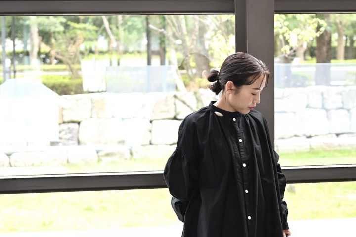 ギャザーやバルーンスリーブが華やかで、女性らしさと格好良さが同居した一着です。