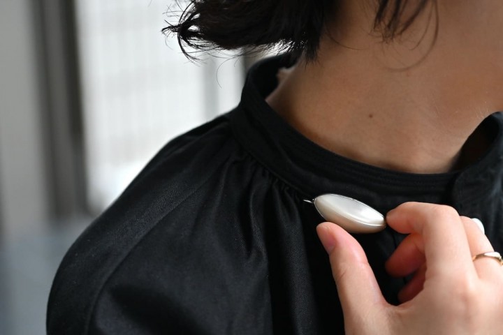 首元にはマザーオブパールのブローチを添えて。ボタンの白とリンクさせ、全体に統一感を出してみました。