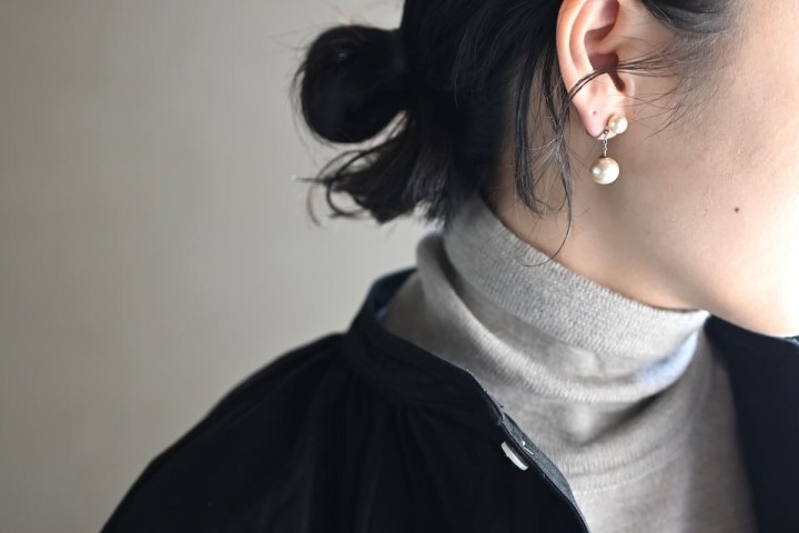 耳元には、イミテーションパールのスクリューイヤリングを。