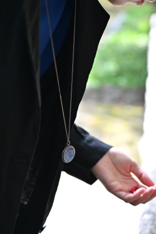“モルフォ蝶”と呼ばれる世界で最も美しい蝶の羽がそのまま入ったロケットネックレスで、鮮やかなブルーが特徴。