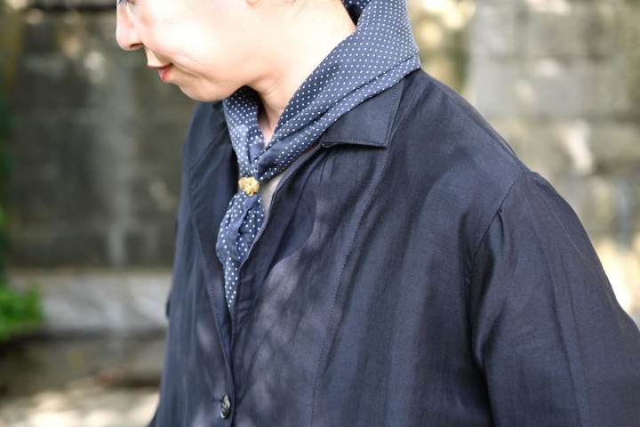 「ワンピースに羽織って、スカーフクリップをポイントに」