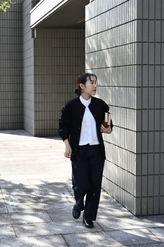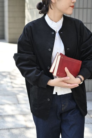 「prit(プリット)」の軽い別珍ブルゾンを羽織れば、急なお出かけにも上品に仕上がります。