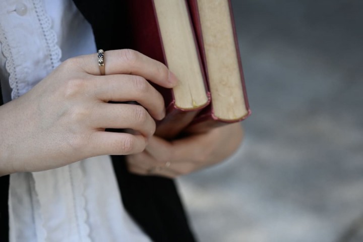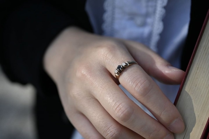 さらに手元には、さりげない輝きが存在感を放つ、ダイアとサファイアのアンティークリングを。