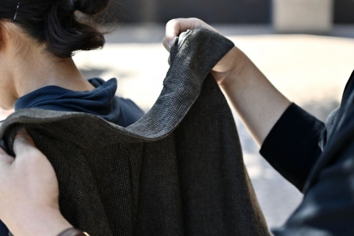明るい時間帯に着ても、重たくならない色合わせ。動きに合わせて生地が少し揺れる感じもいい。