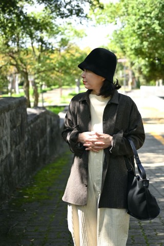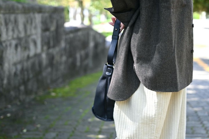 小物は黒でまとめて、少し引き締める。全体に落ち着きが出て、秋らしいバランスに。