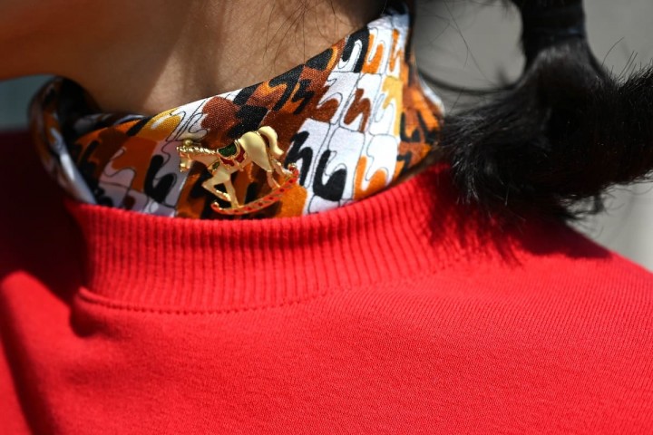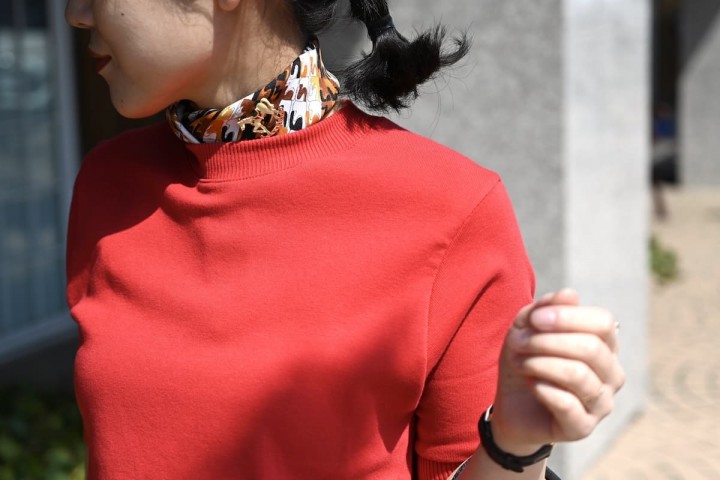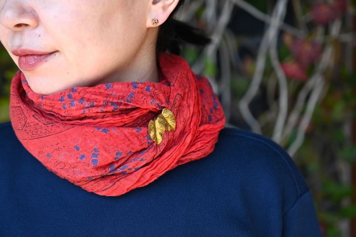 大判のスカーフは、くしゃっと巻いてスカーフリングで留めるだけ。