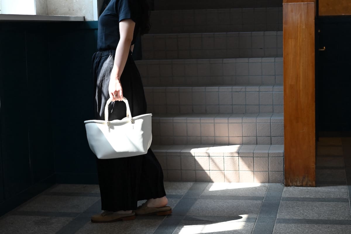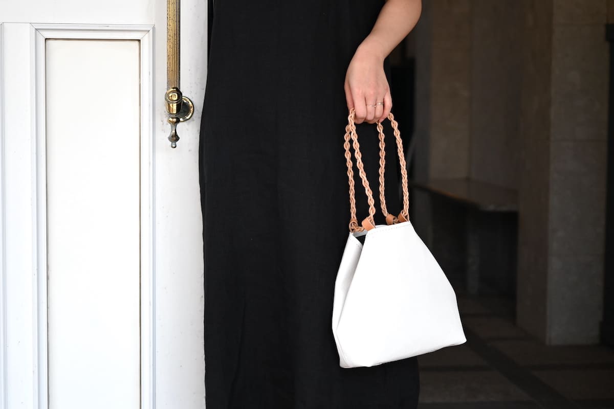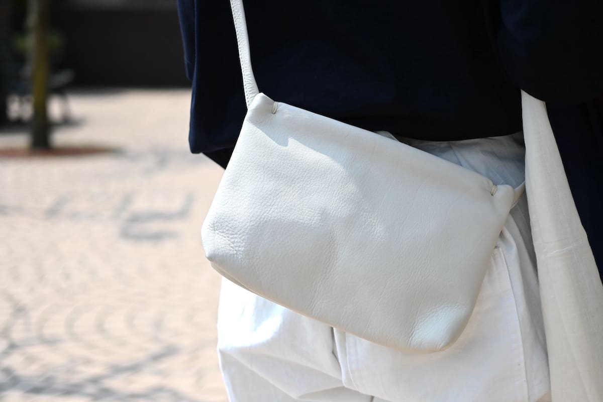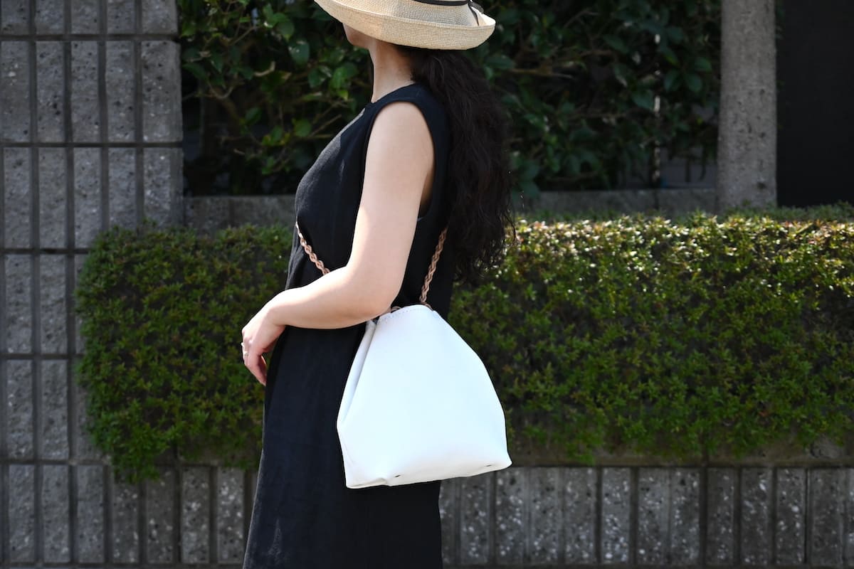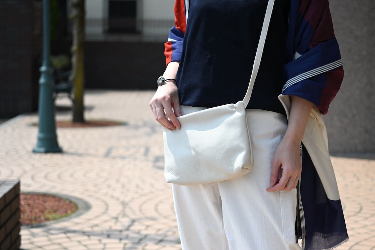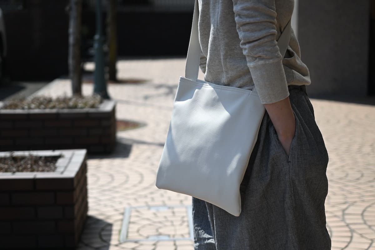 「軽やかに、涼やかに。着こなしのバランスを整える、白いレザーバッグ」です。