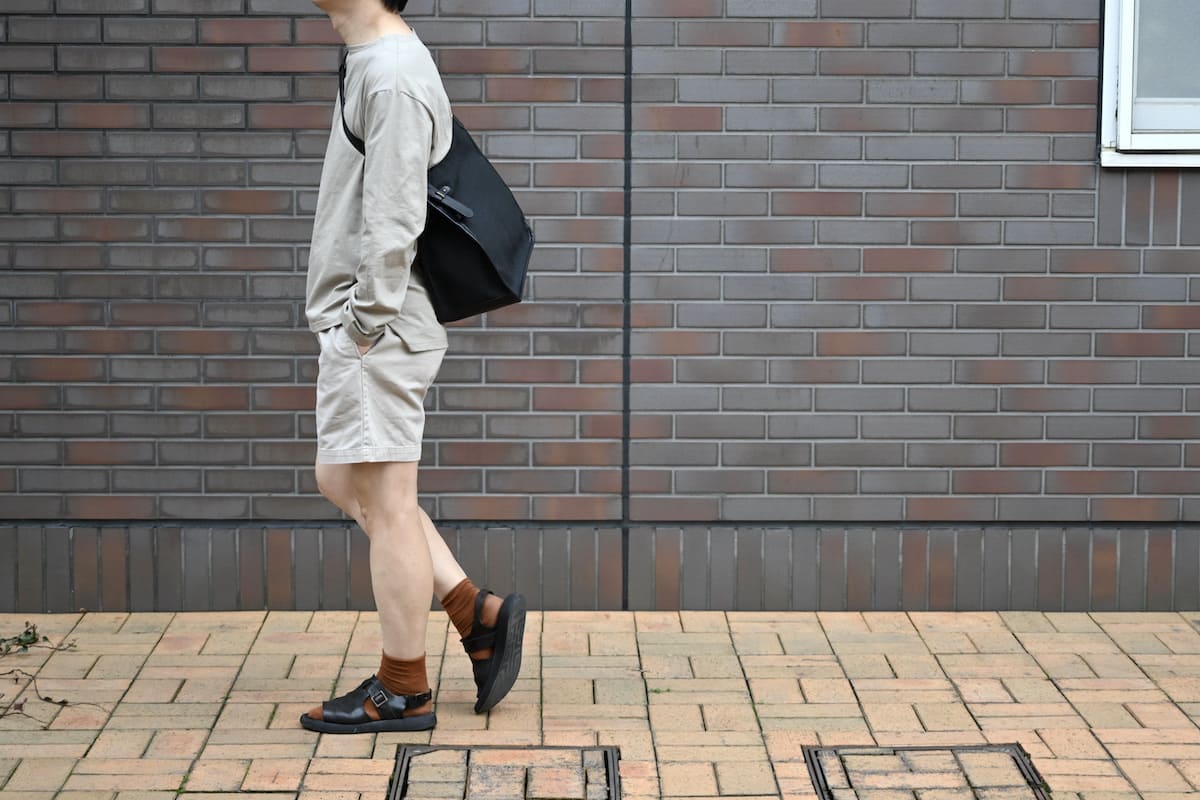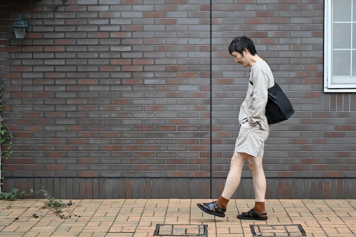 Tシャツにペーパー素材の帽子、イタリアのレザーサンダル…